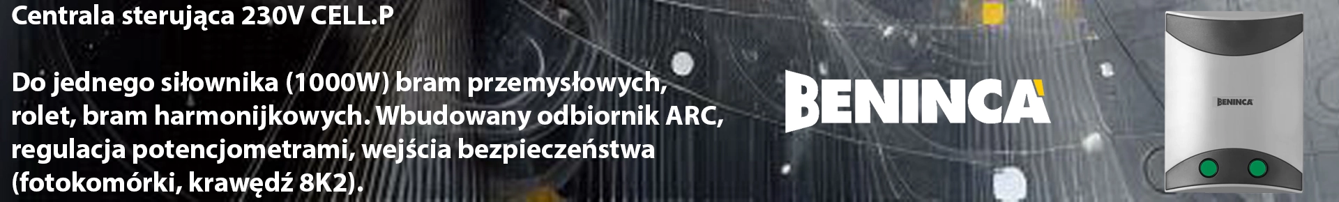Beninca CELL.P: Centrala sterująca 230V do jednego siłownika (1000W) bram przemysłowych, rolet, bram harmonijkowych. Wbudowany odbiornik ARC, regulacja potencjometrami, wejścia bezpieczeństwa (fotokomórki, krawędź 8K2).