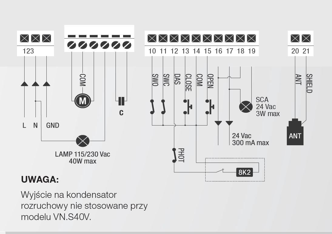 - Wyjście na Oświetlenie Serwisowe/Wskaźnik Położenia Bramy (SCA): Możliwość podłączenia dodatkowego oświetlenia lub sygnalizatora stanu bramy.