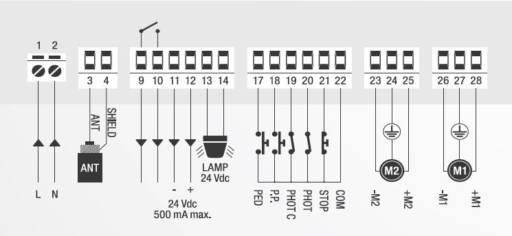 - Wszechstronne Wyjścia: Centrala oferuje wyjście na lampę sygnalizacyjną 24Vdc, konfigurowalne wyjście pomocnicze 24Vdc (0.5A max) na oświetlenie serwisowe/wskaźnik położenia bramy (SCA)/drugi kanał radiowy, a także wyjście na zamek elektryczny (12Vdc 15W, wymaga modułu L.BY, jeśli nie jest zintegrowany z siłownikiem).