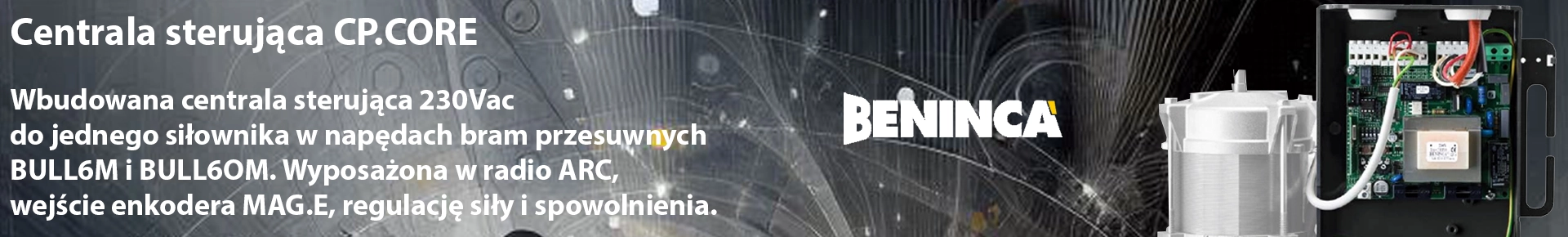 Beninca CP.CORE: Wbudowana centrala sterująca 230Vac do jednego siłownika w napędach bram przesuwnych BULL6M i BULL6OM. Wyposażona w radio ARC, wejście enkodera MAG.E, regulację siły i spowolnienia.