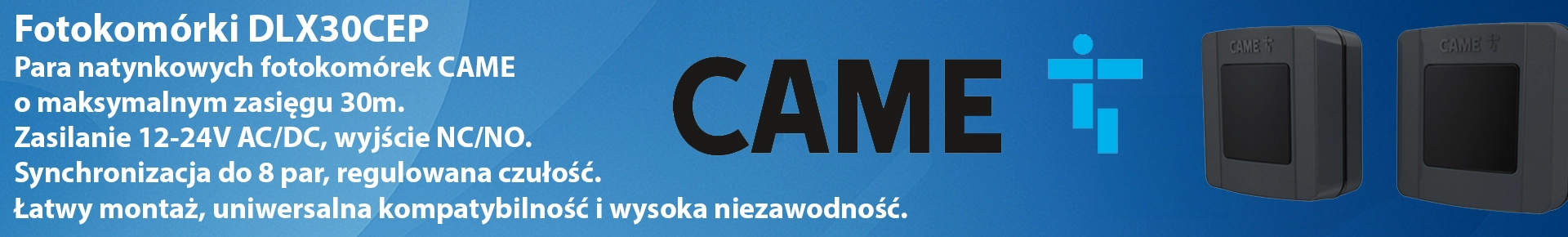 CAME DLX30CEP (806TF-0080): Para natynkowych fotokomórek CAME o maksymalnym zasięgu 30m. Zasilanie 12-24V AC/DC, wyjście NC/NO. Synchronizacja do 8 par, regulowana czułość. Łatwy montaż, uniwersalna kompatybilność i wysoka niezawodność.