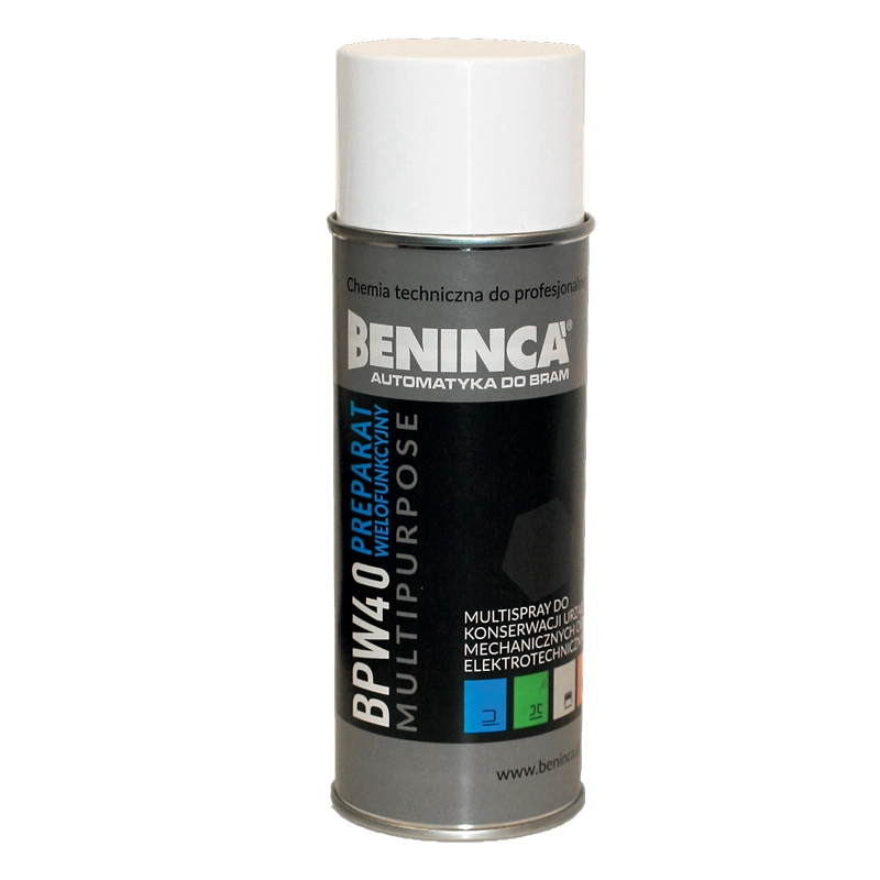Beninca BPW40: Wielofunkcyjny preparat 6w1 w sprayu (400ml). Smaruje, odrdzewia, penetruje, konserwuje, wypiera wodę i czyści. Idealny do automatyki bram, narzędzi i mechanizmów. Nie zawiera silikonu.