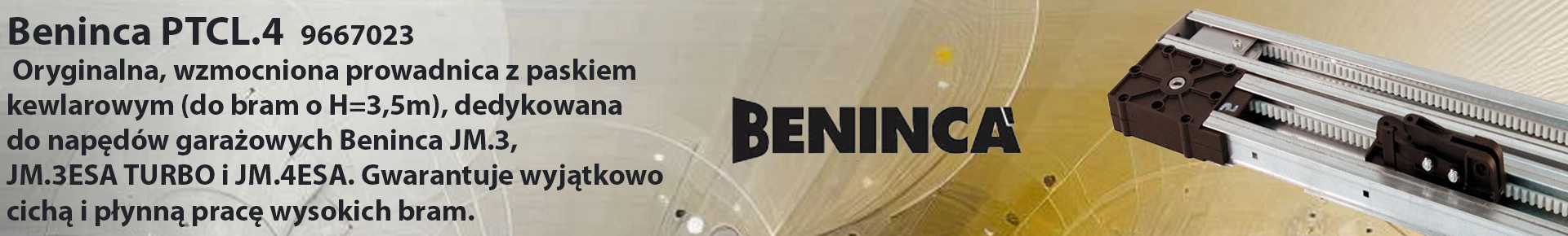 Beninca PTCL.4: Oryginalna, wzmocniona prowadnica z paskiem kewlarowym (do bram o H=3,5m), dedykowana do napędów garażowych Beninca JM.3, JM.3ESA TURBO i JM.4ESA. Gwarantuje wyjątkowo cichą i płynną pracę wysokich bram.