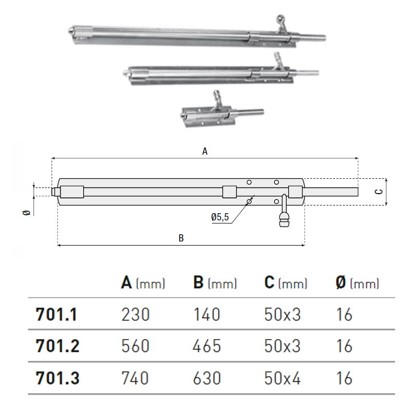 Szeroki Wybór Długości: Seria 701 oferuje aż trzy warianty długości: 230 mm, 560 mm i 740 mm. Z łatwością dobierzesz rygiel idealnie dopasowany do wysokości i konstrukcji Twojej bramy, co zapewnia nie tylko skuteczne działanie, ale również estetyczny wygląd.