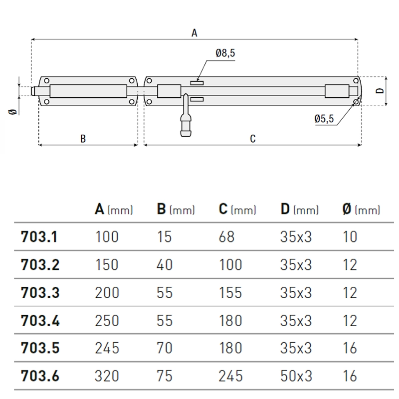 Szeroki Wybór Wariantów: Seria 703 oferuje sześć wariantów, różniących się długością i grubością trzpienia. Z łatwością dobierzesz rygiel idealnie dopasowany do wysokości, wagi i wymagań bezpieczeństwa Twojej bramy, co zapewnia nie tylko skuteczne działanie, ale również estetyczny wygląd.