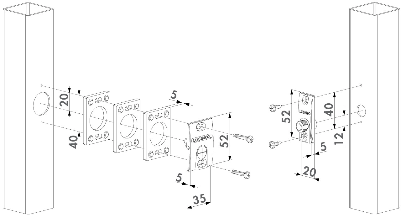 4. Dyskrecja i Estetyka System został zaprojektowany tak, aby był niemal niewidoczny. Większa część mechanizmu ukryta jest wewnątrz profilu (wymaga nawiercenia otworu montażowego Ø25 mm) , a na zewnątrz widoczna jest jedynie elegancka, płaska osłona z logo Locinox.