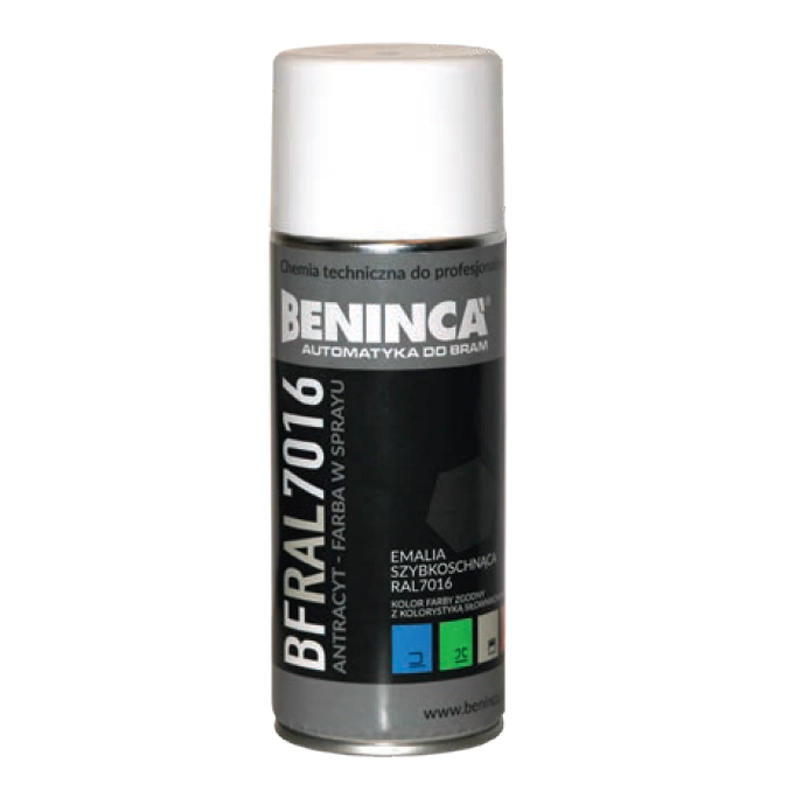 Beninca BF RAL7016: Wysokiej jakości szybkoschnąca farba akrylowa w sprayu (400ml) w kolorze RAL 7016 Antracyt. Idealna do poprawek lakierniczych i malowania automatyki bram (w kolorze siłowników BILL) Beninca oraz innych powierzchni metalowych. Zapewnia trwałe i estetyczne wykończenie.