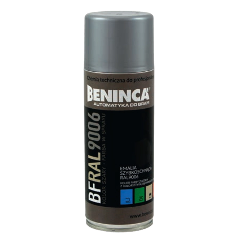 Beninca RAL9006: Wysokiej jakości szybkoschnąca farba w sprayu (400ml) w kolorze srebrnym RAL9006 (Weissaluminium). Idealna do poprawek lakierniczych i renowacji siłowników Beninca (m.in. BULL, BOB) oraz innych powierzchni metalowych. Zapewnia trwałe i estetyczne wykończenie.