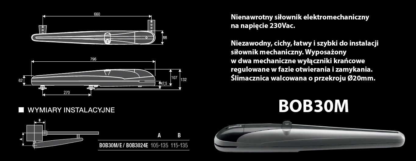 Beninca BOB30M: Mocny i niezawodny siłownik elektromechaniczny 230Vac do bram skrzydłowych (do 3m). Wbudowane wyłączniki krańcowe, solidna konstrukcja z elementami ze stali i brązu. Cicha praca i włoski design.