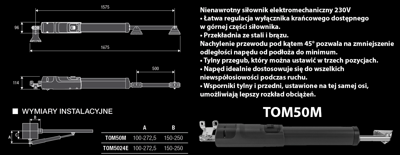 - Zestaw KTOM50M.P z siłownikami TOM50M jest przeznaczony do automatyzacji bram skrzydłowych, gdzie długość jednego skrzydła nie przekracza 5 metrów.