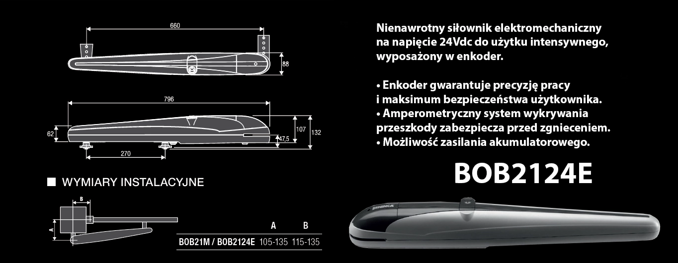 Beninca BOB2124E: Zaawansowany siłownik 24Vdc z enkoderem do bram skrzydłowych (do 2,1m). Zapewnia maksymalne bezpieczeństwo, precyzyjny i cichy ruch. Idealny do intensywnej pracy, z opcją zasilania awaryjnego.