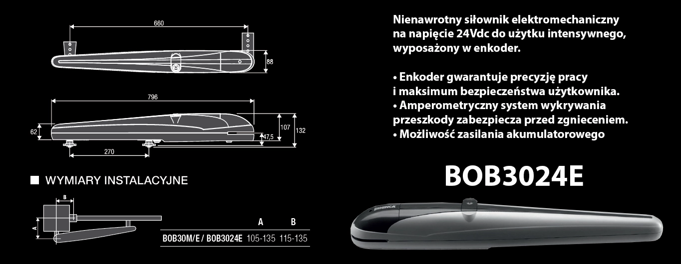 Beninca BOB3024E: Mocny i precyzyjny siłownik 24Vdc z enkoderem do bram skrzydłowych (do 3m). Wbudowane wyłączniki krańcowe, solidna konstrukcja. Cicha praca i włoski design. Maksymalne bezpieczeństwo i możliwość zasilania awaryjnego.