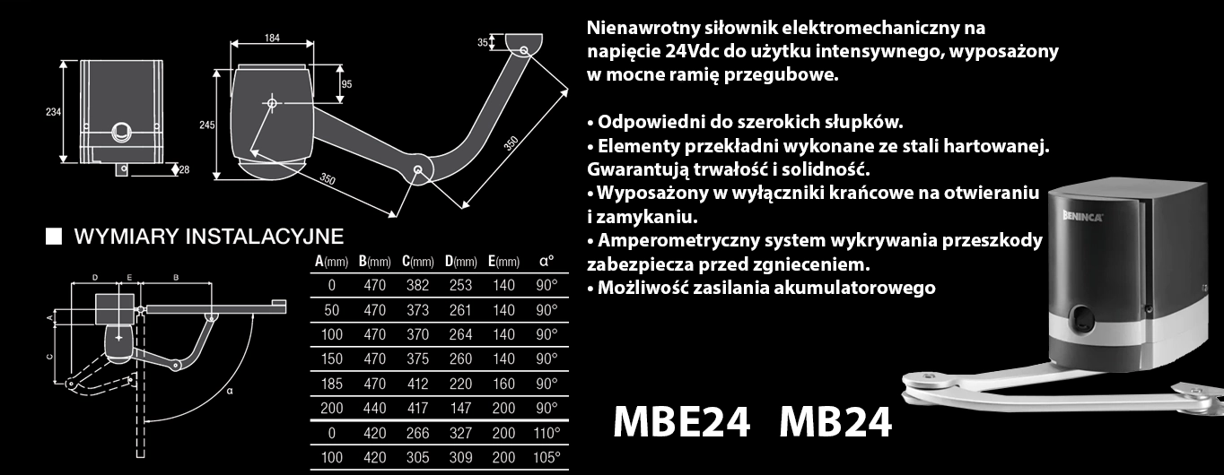 Beninca KMB24.PM: Kompletny zestaw 24Vdc z siłownikami MBE24 z enkoderem i ramieniem łamanym (sprzedawane osobno) do bram skrzydłowych (do 2,5m), idealny na szerokie słupki. Do intensywnej pracy, z amperometryką i opcją zasilania awaryjnego.