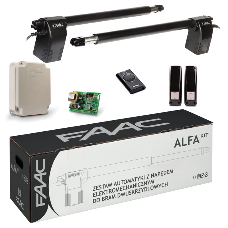 - Kompletny zestaw: ALFA 414 to gotowe rozwiązanie, zawierające wszystkie niezbędne elementy do automatyzacji bramy dwuskrzydłowej o długości skrzydła do 3 metrów.