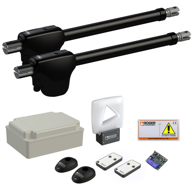 Kompletny zestaw automatyki do bram skrzydłowych ROGER KIT MONOS4/220/F. Przeznaczony do skrzydeł o długości do 4 metrów. Wytrzymałe siłowniki teleskopowe 230V, aluminiowy korpus i włoski design gwarantują niezawodność w każdych warunkach pogodowych.