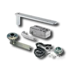 Beninca SB.DU180.L: Specjalistyczny zestaw odblokowania z dźwignią i przekładnią łańcuchową do siłowników podziemnych Beninca DU.IT. Umożliwia otwarcie bramy aż do 180 stopni, zapewniając maksymalną przestrzeń i proste, szybkie odblokowanie awaryjne.